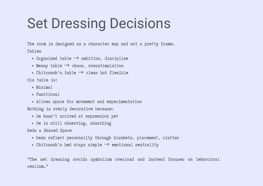 My role extended across Script breakdown and storyboard translation, Spatial planning and visual continuity, Set design and prop logic,